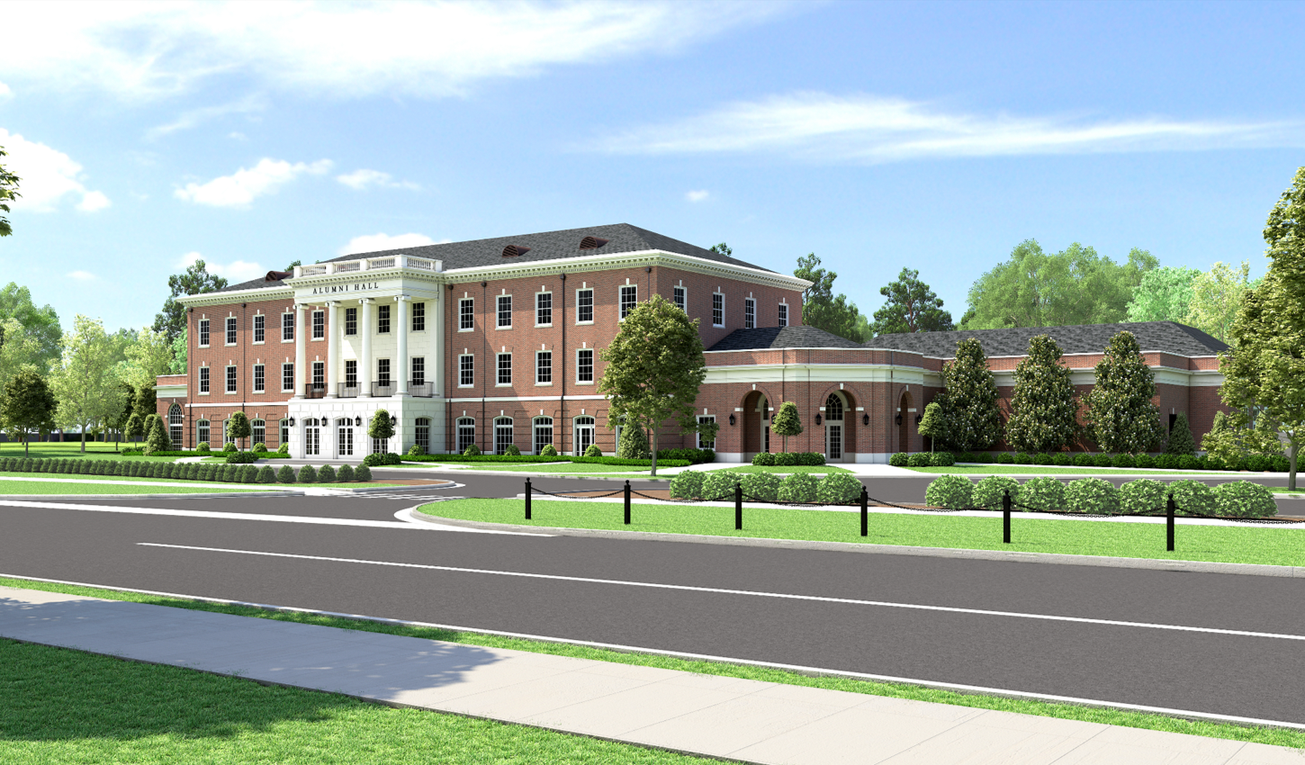 Coming soon, the New Alumni Hall – a dedicated home for our alumni and friends to someday connect — and reconnect — with all things Bama. Residing on the southeast corner of the historic Peter Bryce Park Preserve, the new home of UA’s Division of Advancement will enjoy picturesque views from each of the building’s three stories. The New Alumni Hall will be located on the Bryce Campus along with the new Performing Arts Academic Center and the Bryce Main, providing access to world-class theatre and dance performances as well as state-of-the-art museums. When complete, the New Alumni Hall will provide a dedicated home and sense of community for alumni, friends, and supporters of the university. Along with offices and administrative staff spaces, the New Alumni Hall will house a 400-person ballroom, as well as other event and event support spaces. The courtyard area opening up to the Peter Bryce Park Preserve will provide an idyllic event area for alumni and friends to gather. The construction of a storm shelter will enhance not only the safety of the building, but of the surrounding Bryce campus. |